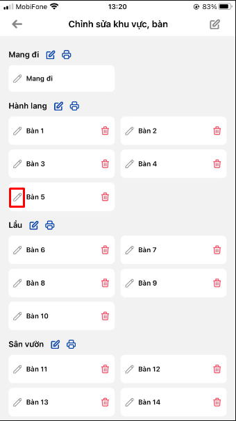 Bước 1: Tại menu "Quản lý bàn" > chọn nút