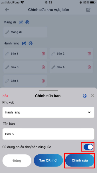 Bước 2: Tại dòng "Sử dụng nhiều đơn/bàn cùng lúc" bật icon sang phải > chọn nút "Chỉnh sửa" để lưu lại.