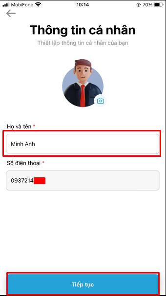 Nhập họ và tên >> chọn nút "Tiếp tục"