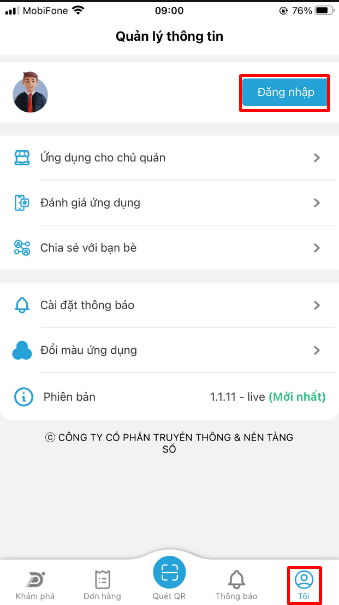 mở trang quản lý thông tin >> chọn nút "Đăng nhập"