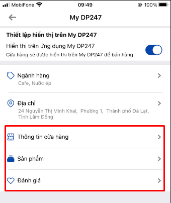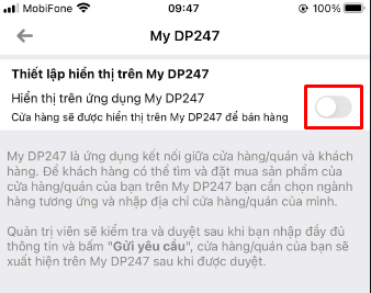 >> click sang phải để bật >> cửa hàng sẽ được hiển thị trên My DP247 để bán hàng