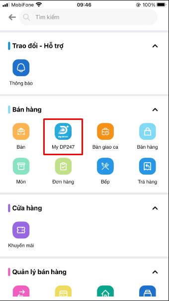 Hoặc nếu chưa có ở khung chức năng "Quản lý thông minh", bạn vào "+ Xem thêm" > khung chức năng "Bán hàng" >> chọn "My DP247"