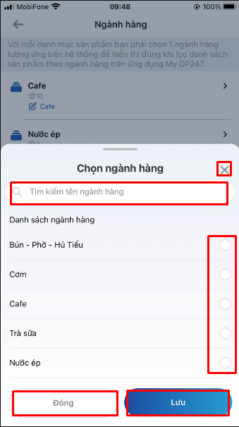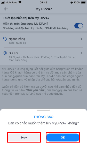 - Sau khi hoàn tất thông tin chọn ngành hàng và địa chỉ, bạn chọn nút "Lưu" >> chọn "OK" để thêm lên My DP247, hoặc nút "Hủy" hủy bỏ hiển thị