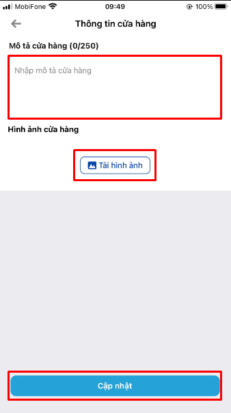 - Cập nhật thông tin cửa hàng: nhập mô tả cửa hàng, tải ảnh lên >> chọn nút "Cập nhật"