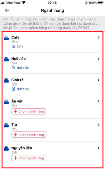 - Chọn ngành hàng: click vào "+ Chọn ngành hàng"