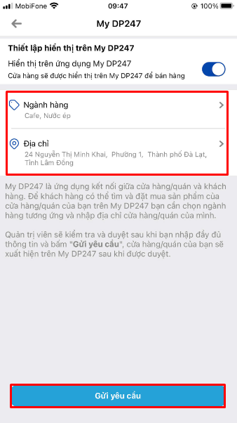 Sau khi bật sẽ hiện ngành hàng và địa chỉ >> bạn cần chọn ngành hàng tương ứng và địa chỉ cửa hàng của bạn. Sau đó chọn nút "Gửi yêu cầu"