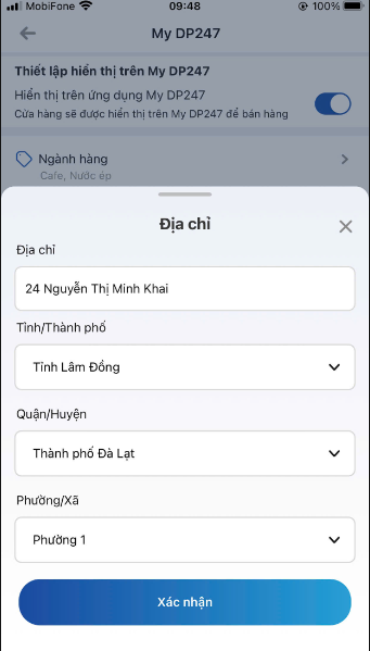 - Chọn địa chỉ: địa chỉ đã được thiết lập tại chức năng cập nhật thông tin cửa hàng, bạn có thể cập nhật lại tại đây >> chọn nút "Xác nhận"