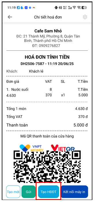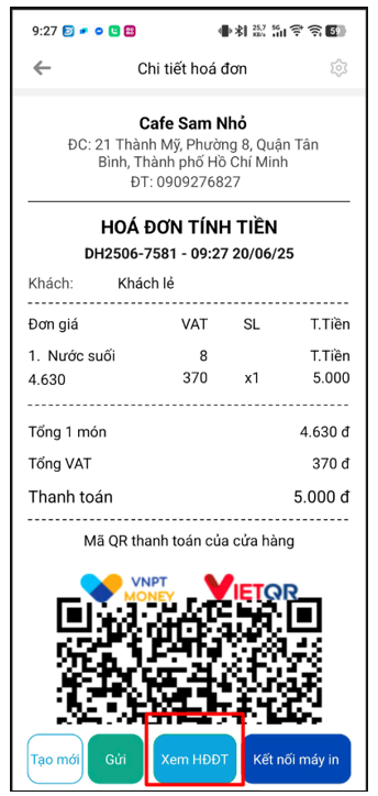 Khi đơn hàng đã hiện chi tiết hóa đơn. Người dùng có thể thấy nút ‘Tạo HĐĐT’, bấm vào để tảo hóa đơn điện tử, sau đó nút sẽ chuyển thành ‘Xem HĐĐT’
