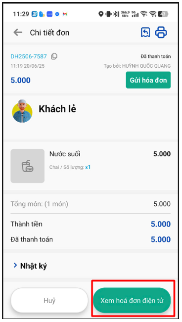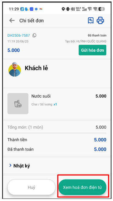 Đối với đơn hàng đã tạo hóa đơn điện tử, người dùng vào chi tiết đơn hàng, chọn xem hóa đơn điện tử