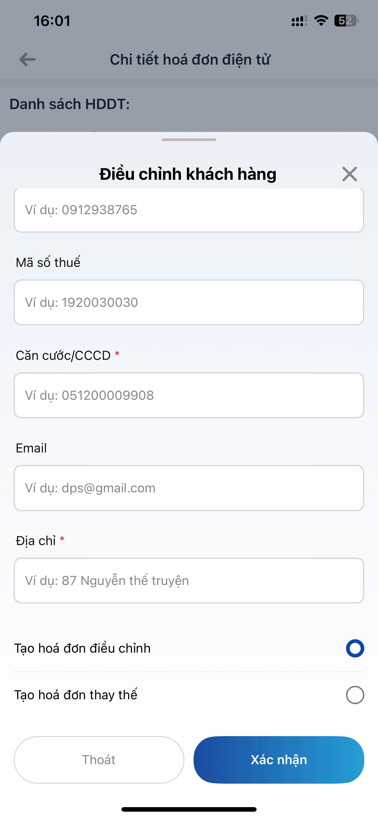 Sẽ có 2 trường hợp đối với chỉnh sửa thông tin khách hàng đã tạo hóa đơn điện tử là tạo hóa đơn điều chỉnh và tạo hóa đơn thay thế: