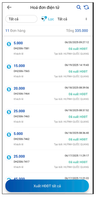 Các đơn hàng đã được xuất hóa đơn điện tử sẽ được hiện lên danh sách tại menu hóa đơn điện tử