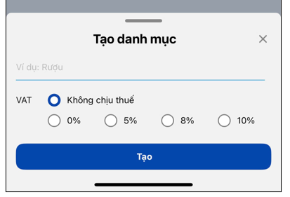 Bước 3. Tạo danh mục theo ngành hàng và VAT tương ứng: điền tên >> mức VAT tương ứng >> Tạo để tạo danh mục mới