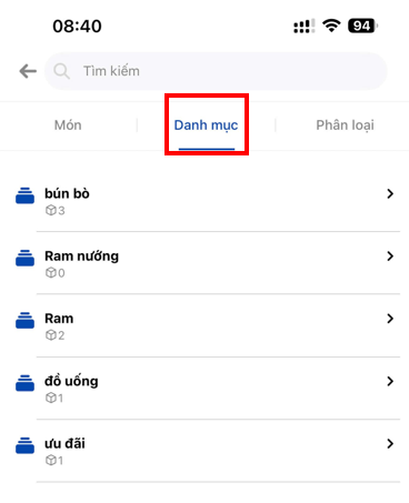 Bước 4. Bấm vào danh mục vừa tạo chọn “Thêm món” để thêm các sản phẩm vào danh mục (các sản phẩm trong danh mục sẽ chịu mức VAT tương ứng với danh mục)