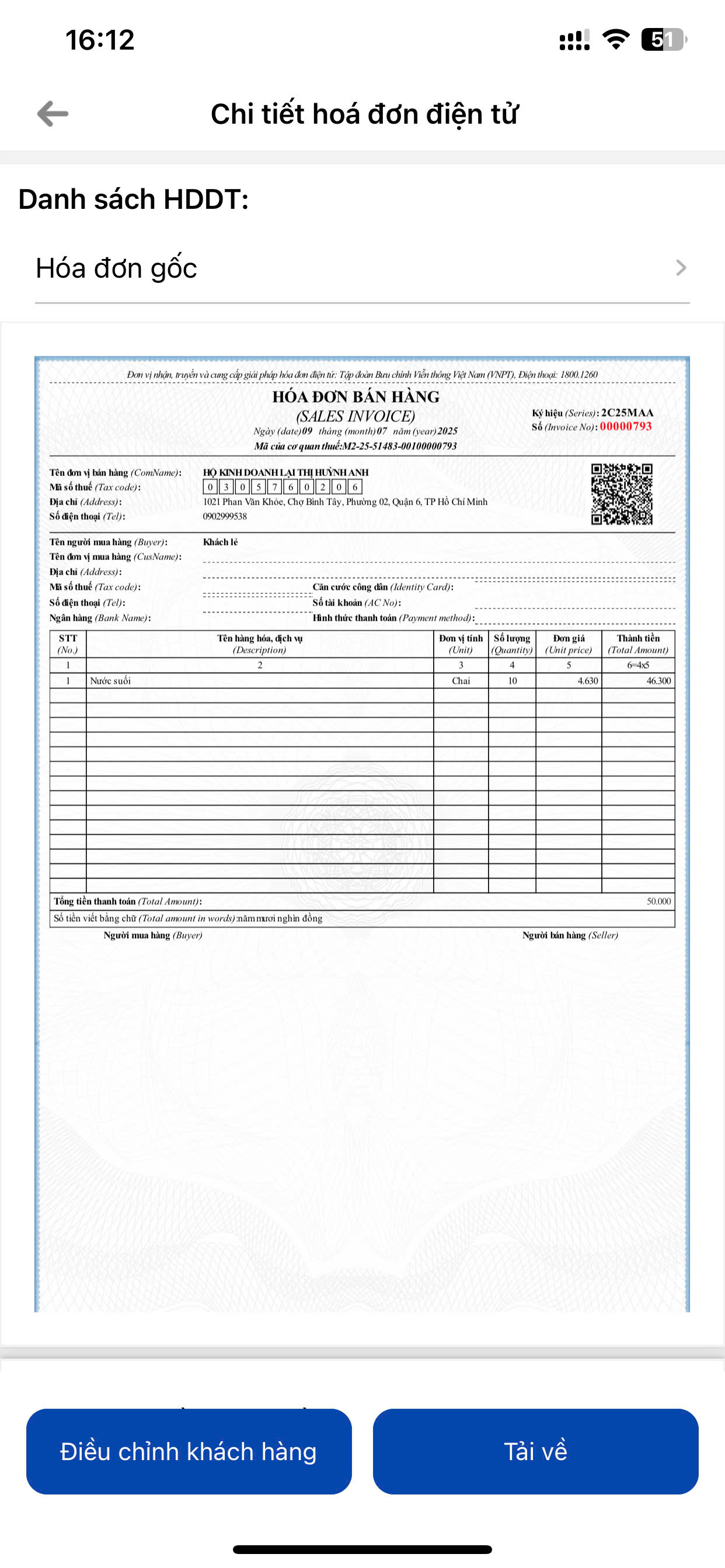 Khi trang chi tiết hóa đơn điện tử hiển thị, chọn nút điều chỉnh khách hàng hoặc tải về hóa đơn điện tử